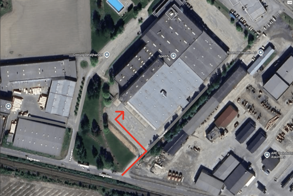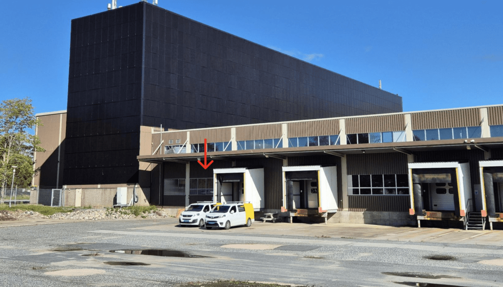 Når du er i Sagveien 25, gå til port 1. Til venstre for porten, følger du skiltet «Til vareutlevering».