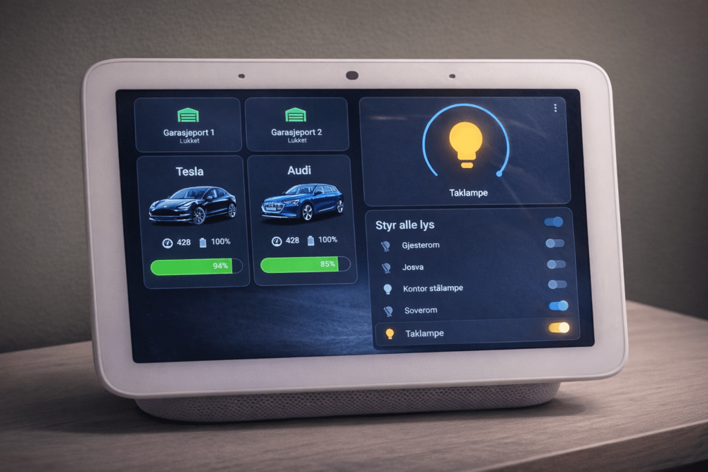 Dashboardet fra Home Assistant vises på alle Google-skjermer i huset. Lys, porter, biler, alarm og strømforbruk er tilgjengelig med ett trykk eller stemmestyring via Google Assistant.